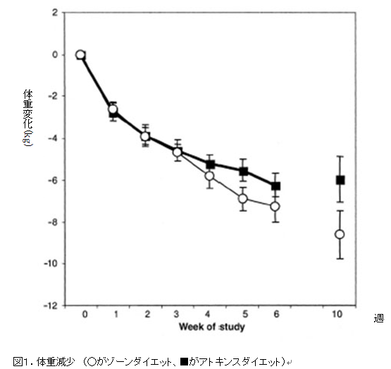 体重減少という点においては、図1に見られるように、最初の6週間にゾーンダイエットを実践した人々の方がケトン体を産出するダイエットを実践した人々よりもやや多く減量できました。