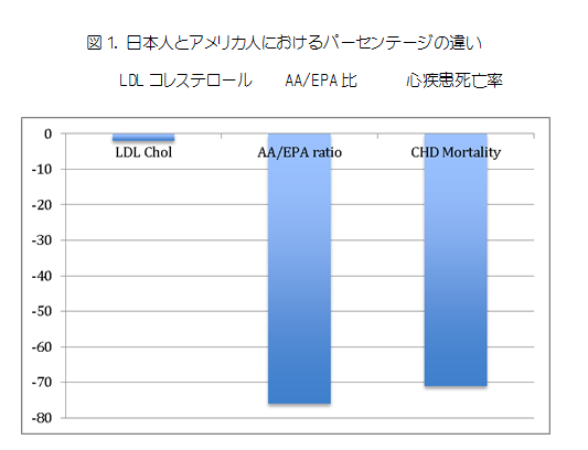 これ以上進んだ統計がなくても、両国の心臓疾患による死亡率の差は、LDLコレステロールレベルの差ではなくAA/EPA比の差とより関連が深いということが見てとれると思います。